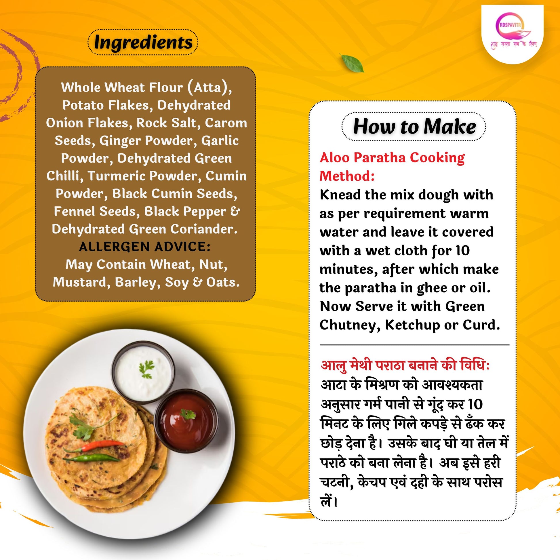 Craving that homemade Aloo Paratha but short on time? RDSPavitr’s Aloo Paratha brings you the same comfort and taste of a traditional Indian kitchen — without the hassle. Made with whole wheat flour, real potato flakes, and a perfect blend of dehydrated onions, green chillies, and classic Indian spices, it’s a delicious, ready-to-cook flatbread that feels like home in every bite.