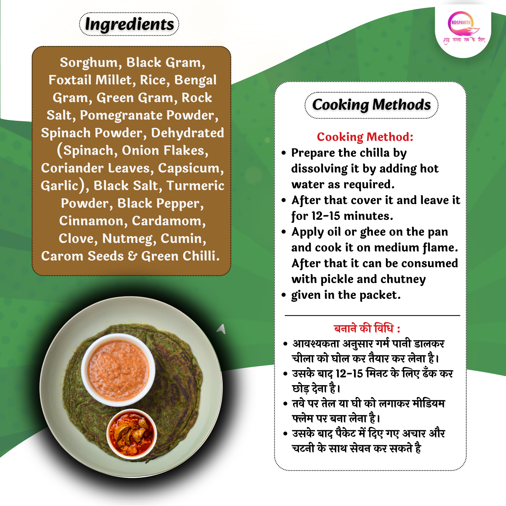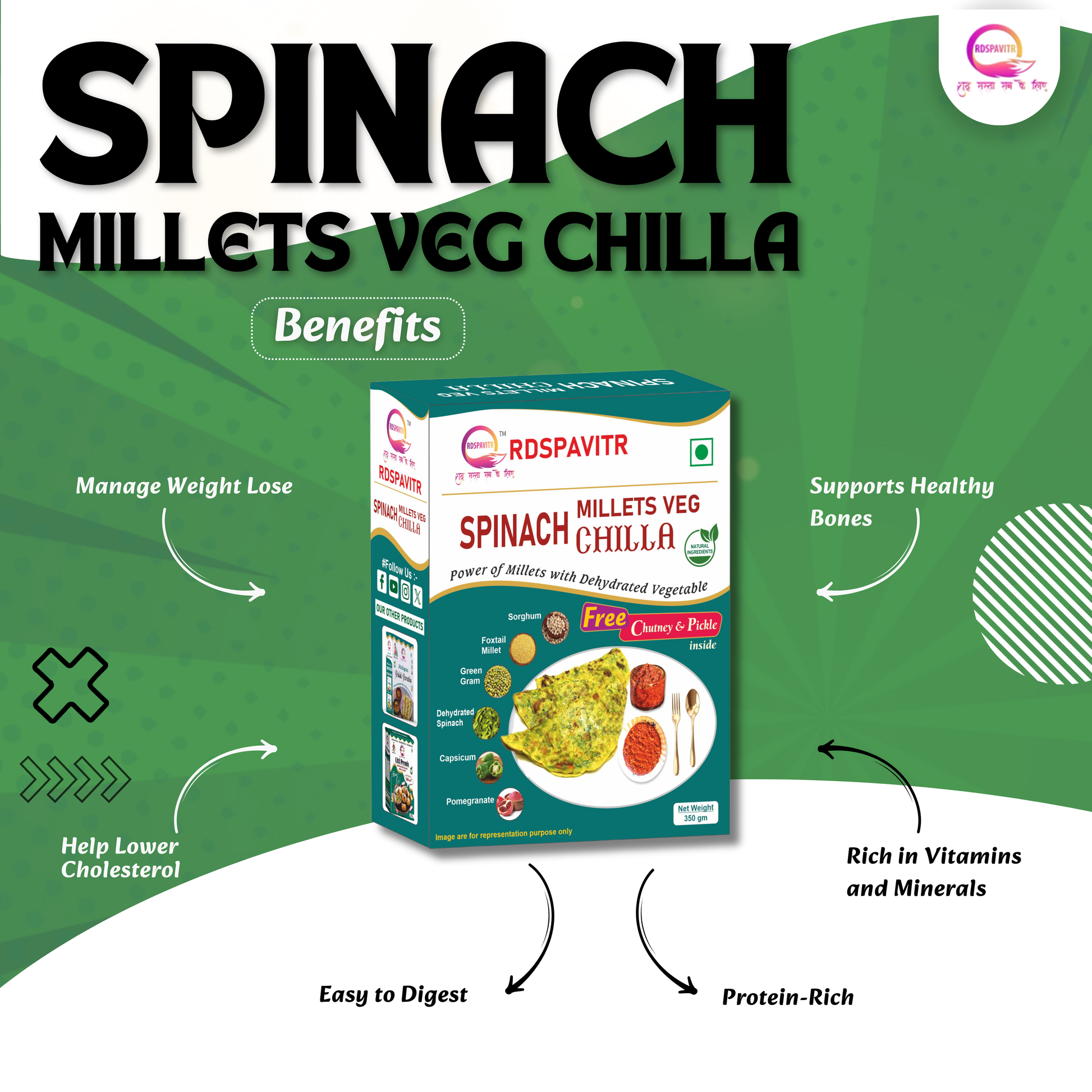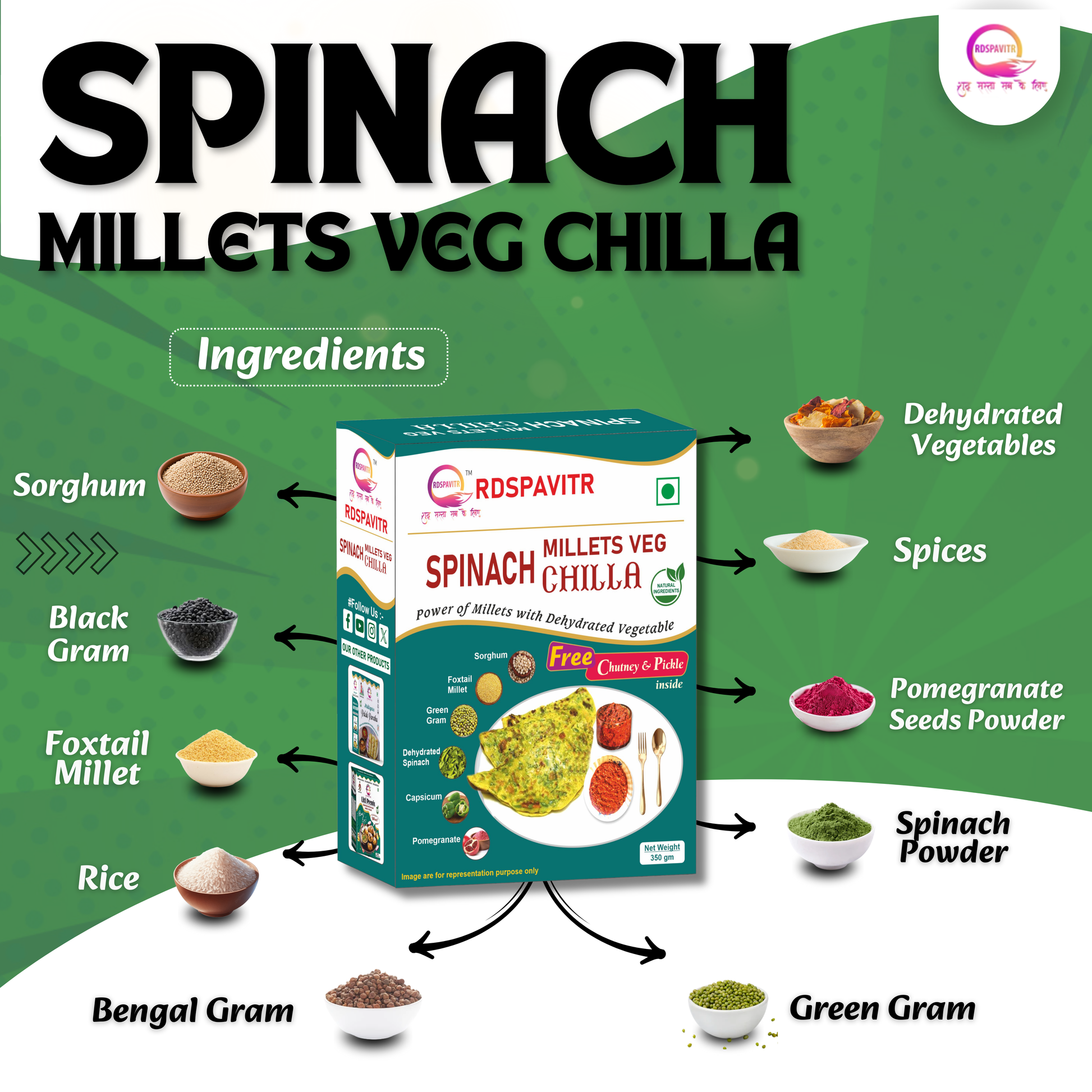 RDSPAVITR Spinach Millets Veg chilla is made by blending chopped spinach with besan (gram flour), water, and spices into a smooth batter, which is then cooked like a pancake on a skillet. It’s gluten-free, vegan-friendly, and packed with flavor.