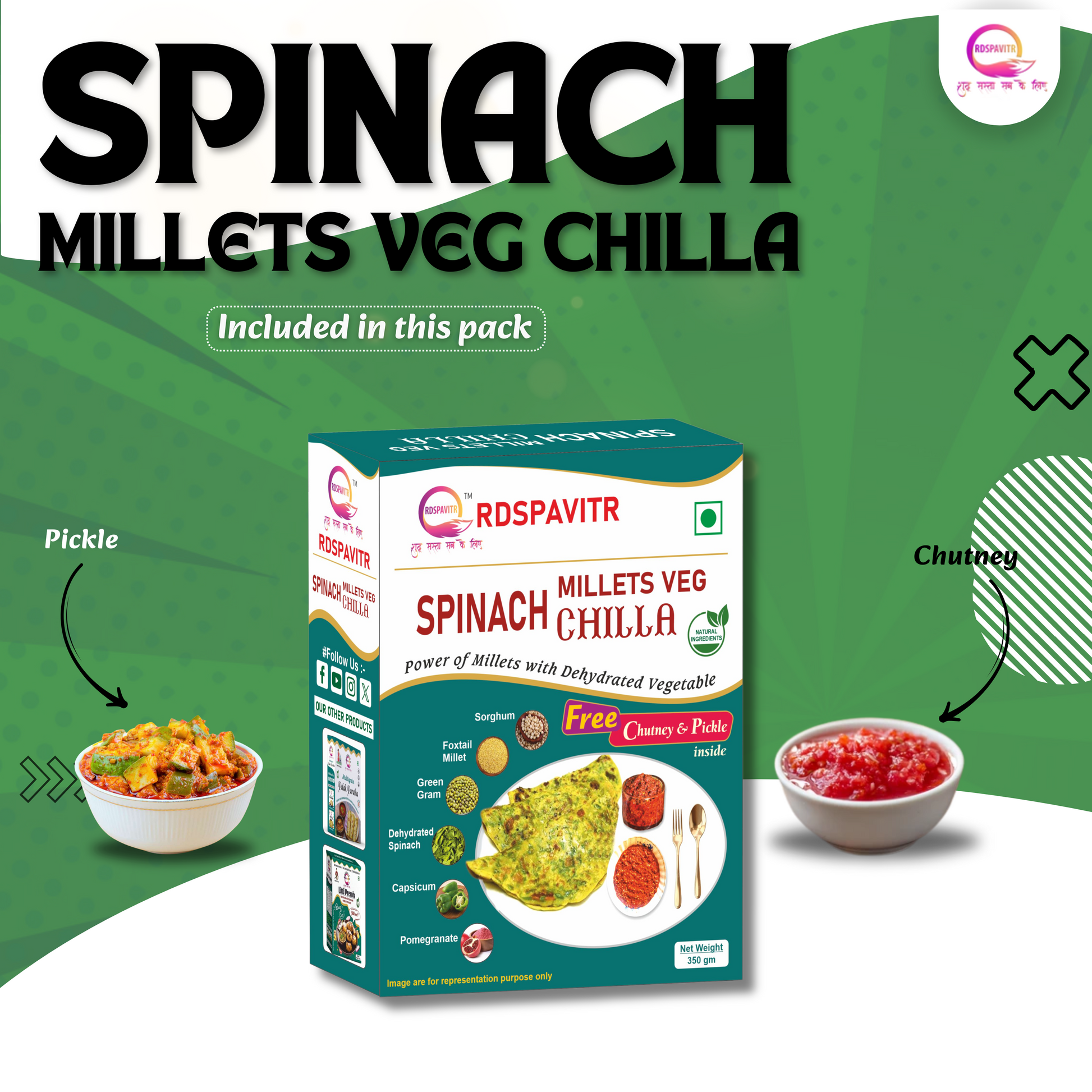 Spinach Millets Veg Chilla | Chilla Premix 250 Gm, Peanut Chutney 50g and Mix Pickle 50g | Ready To Cook | No Preservative | Made With Natural Ingredients